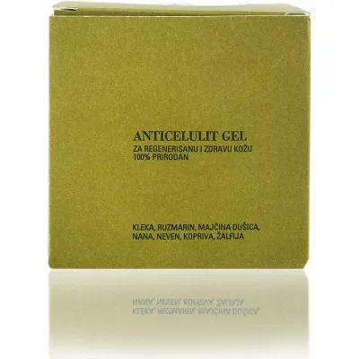 Anticelulit gel iz kolekcije Stara Planinska Riznica je 100% prirodna i efikasna kombinacija aktivnih materija ekstrakata kleke, ruzmarina, majčine dušice, nane, nevena, koprive i žalfije. Ovaj gel čisti i hrani kožu, podstiče cirkulaciju što dovodi do bržeg razmnožavanja zdravih ćelija u međućelijskom prostoru i istiskivanja vode u kojoj se pod uticajem štetnih faktora (pušenje, nepravilna ishrana, nedovoljna fizička aktivnost) vremenom talože toksične materije. Za regenerisanu i zdravu kožu 100% prirodan.