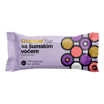 Granum Bar sa šumskim voćem je 100% prirodan i nutritivno bogat proizvod, namenjen sladokuscima koji misle na svoje zdravlje. Kombinacija hrskave teksture bezglutenskih žitarica i sočnosti maline i borovnice daju baru jedinstven ukus.