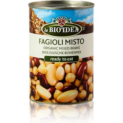 Mešavina barenih mahunarki iz organske proizvodenje - crveni i beli pasulj, leblebija, u konzervi. Sterilisani proizvod. Klasa I.