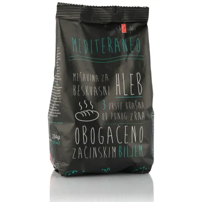 Meditareneo - mešavina za beskvasni hleb. Bez pšeničnog brašna. Napravljena od ječmenih, speltinih i ovsenih žitarica, rogača, lana, ruzmarina, himalajske soli i sode bikarbone. Priprema se uz jednostavno dodavanje vode. Mediteransko bilje I žitarice od punog zrna, daju jedinstvenu, neodljivu aromu I bogat ukus sveže pečenom hlebu koji se najbolje kombinuje sa laganim obrocima, salatama I jednostavnim namazima.