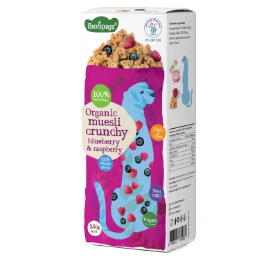 Hrskavi musli proizvod sa borovnicom i malinom. Organski proizvod.