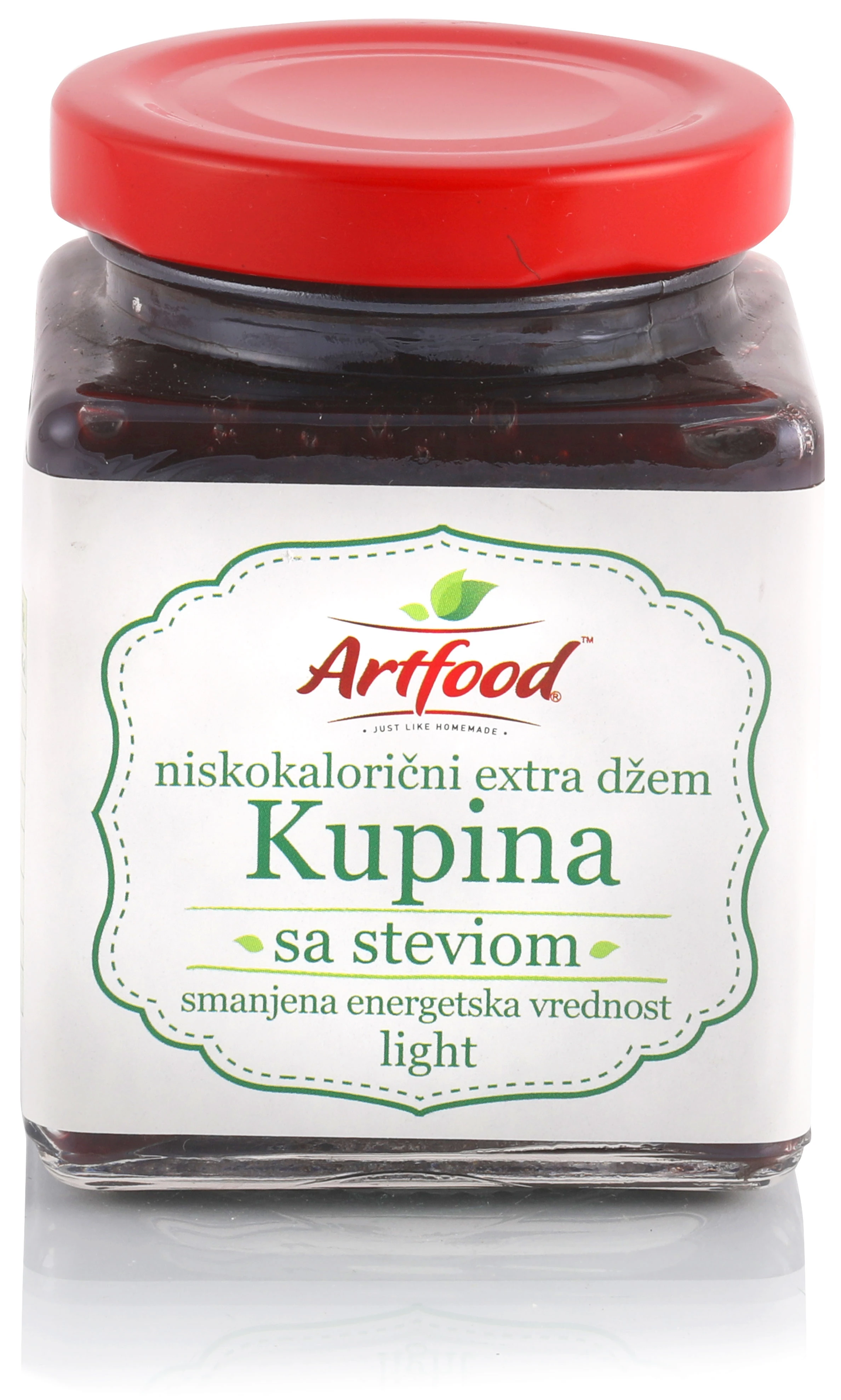 Kupina, fruktoza (18 %), sredstvo za želiranje: pektin, limunska kiselina, antioksidans: askorbinska kiselina, zaslađivač: steviol glikozid. Suva materija 33-38 %.