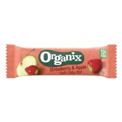 Organix organske ovsene štanglice sa jagodom i jabukom. Sadrže mešavinu integralnog ovsa, suvog grožđa, soka od jabuke i soka od jagode. Uzrast 12M+.