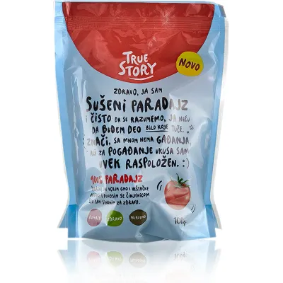 Paradajz, morska so.Količini od 100 g sušenog paradajza odgovara 1 kg svežeg paradajza.Paradajz je nakon branja pripreman i osušen po tehnologiji ACM-2000 na temperaturama koje obezbeđuju da se u najvećoj meri sačuvaju hranljive vrednosti proizvoda. Sušeni paradajz je pakovan u mešavini suncokretovog i maslinovog ulja, a zatim pasterizovan.